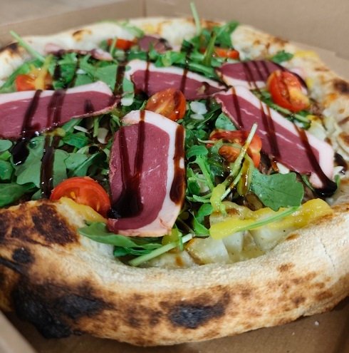 Pizza de décembre Crème, pommes de terre, effiloché de canard confit maison, oignons, roquette, amandes effilées, tomate cerise, gelée d’orange, magret fumé crème balsamique, mozza/emmental, olives.