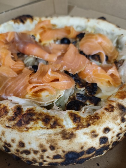 Crème, poireaux étuvés, chèvre, saumon fumé, noix, mozza/emmental, olives.